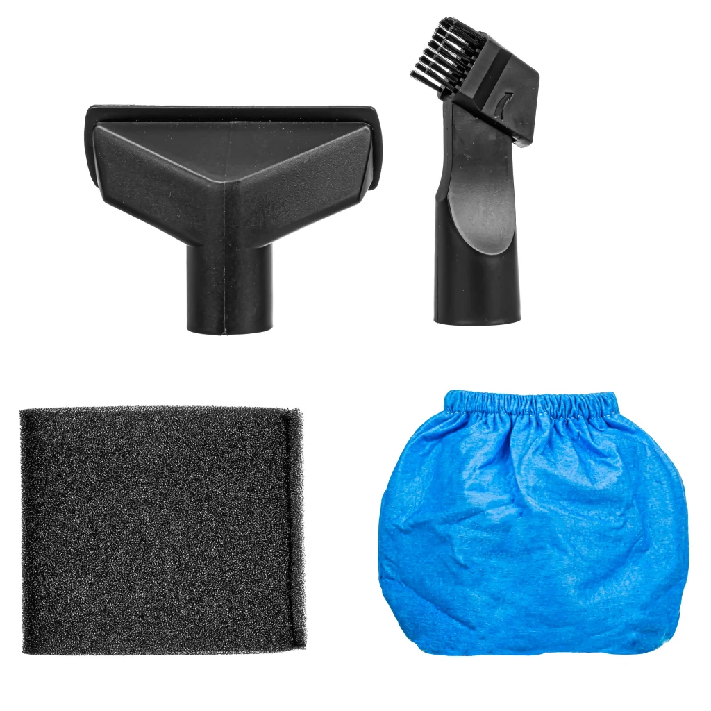 Accesorios: Boquilla ancha, manguera de succión, boquilla para grietas 2 en 1, bolsa de tela, filtro de espuma y ruedas.