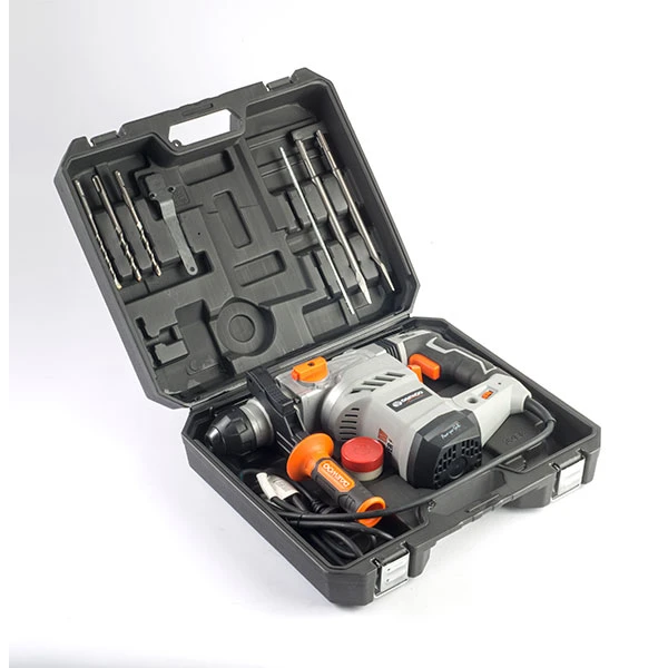 Incluye: 2 Cincel de punta/plano (14×250 mm), 3 Mechas SDS PLUS (8/10/12 mm), Mango auxiliar, Recipiente de grasa, Guardapolvo, Medidor de profundidad y Llave para tapa de la caja de grasa.