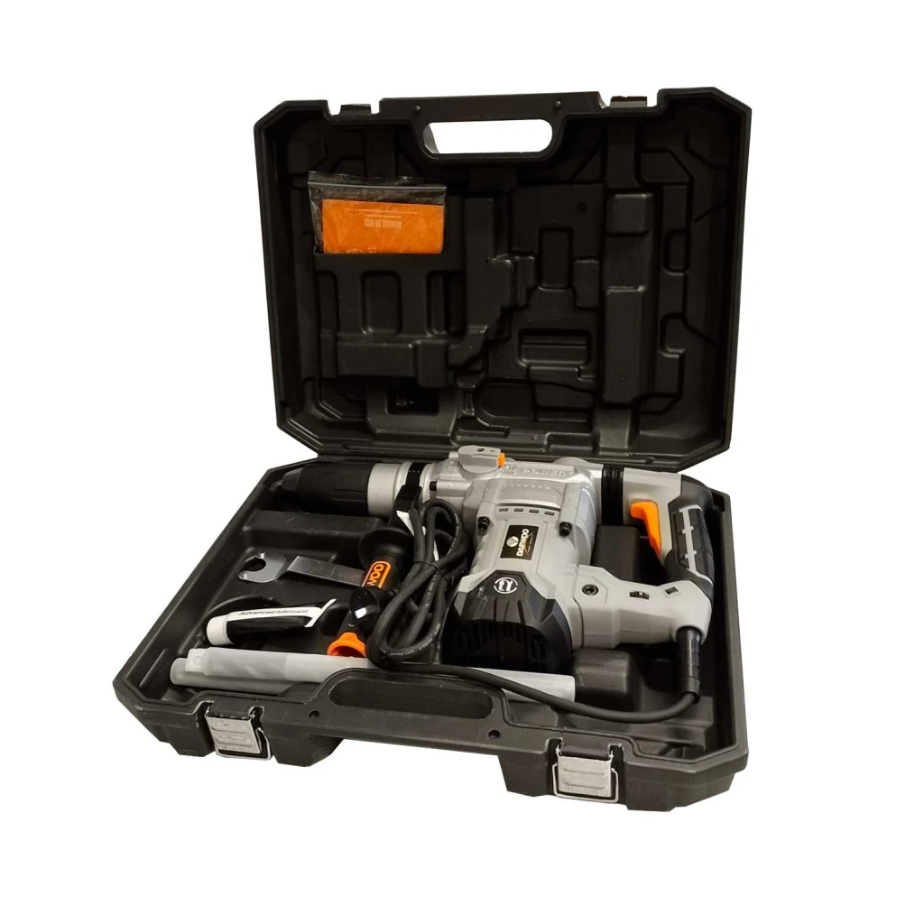 Nuestro rotomartillo de diseño PROFESIONAL DARH40D es una excelente opción para tus trabajos en hormigón, donde podremos utilizar mechas SDS-MAX de hasta 40 mm de diámetro. Una de sus funciones es la FUNCIÓN DE CINCELADO con 9 Joules, donde podemos anular el giro para utilizar un cincel tipo plano o punta. Diseñado con un robusto y confiable motor de 1600w de velocidad variable y cambio de sentido de giro, sumado al cuidado diseño ergonómico y equilibrado con motor vertical. Además de contar con mango auxiliar ideal para trabajos exigentes, maletín y accesorios. Hacen que nuestro DARH40D sea una herramienta equilibrada que nos brindará un excelente resultado en nuestros trabajos diarios.