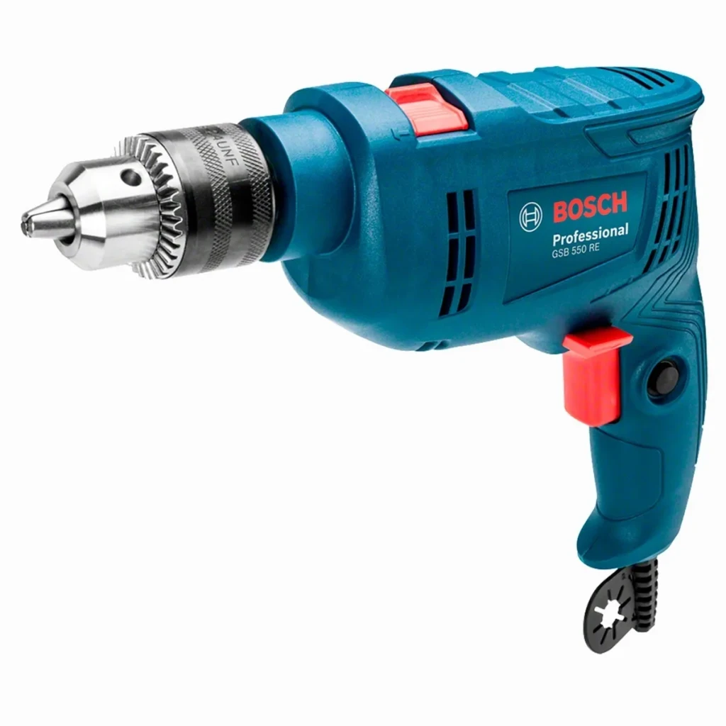 El Taladropercutor Bosch GSB 550 RE es una herramienta eléctrica con una potencia de 550 W, diseñada para perforar en albañilería, madera y metal, tanto con como sin impacto. Cuenta con un botón conmutador que permite cambiar fácilmente entre modos de perforación y atornillado. Además, su función de reversión facilita la extracción de brocas y tornillos.